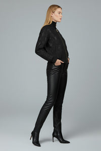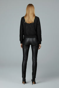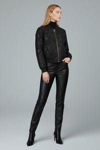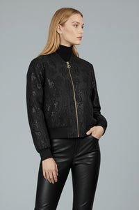 Elevate every outfit with this black jacquard bomber jacket. The subtle floral texture catches the light, while the gold zip and ribbed trims add a sleek, modern finish. Cut to a relaxed, hip-length silhouette that layers effortlessly over knits or tees.