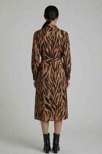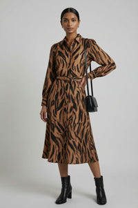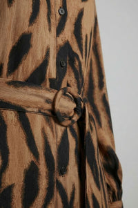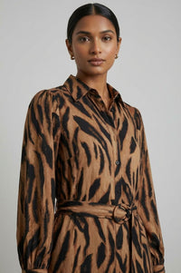 Midi length shirt dress featuring an all-over brown and black tiger print. The garment is constructed with a pointed collar and a full button-front placket with black buttons. It has long sleeves with buttoned cuffs and subtle gathering at the shoulders. A matching self-fabric tie belt with a round, coordinating buckle cinches the waist.