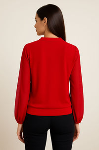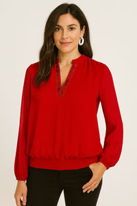 Elevate your wardrobe with this chic red blouse, designed with a touch of sparkle for day-to-night versatility. Featuring a flattering V-neckline with silver sequin trim, this blouse brings understated glamour to your look. The long sleeves with elasticated cuffs and a softly gathered hemline ensure a comfortable fit with a refined silhouette. Perfect for pairing with tailored trousers or jeans, this blouse is a timeless piece that transitions effortlessly from office to evening.