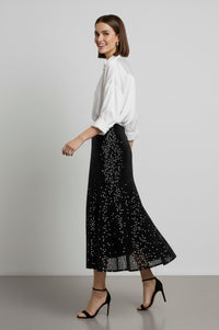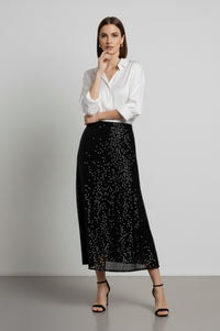 A sleek black midi skirt scattered with light-catching sequins, creating a subtle “stardust” effect. Cut in a straight, softly skimming silhouette with a clean waistband and a lightly sheer hem for movement—effortless glamour from desk to drinks.