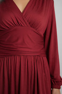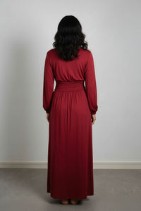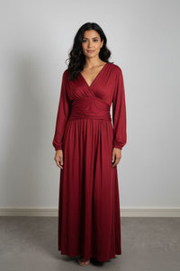 Maxi length dress constructed from a flowing knit fabric. The garment features a surplice V-neckline and long sleeves with elasticated or gathered cuffs. The bodice includes gathered detailing at the shoulders and bust, transitioning into a ruched waistband. The skirt extends in a full, gathered silhouette.