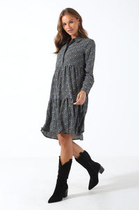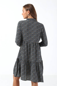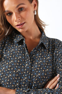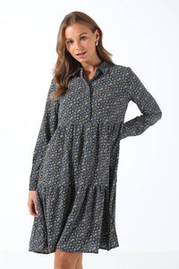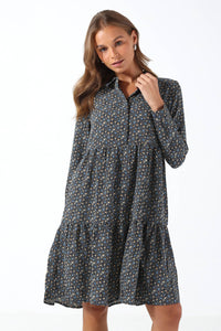 This super cute shirt dress features an all over floral print and frill hem. Perfect for layering with knit cardigan and boots.