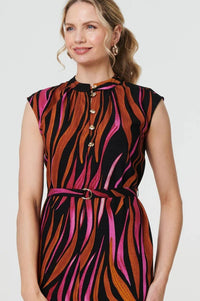 This midi dress is a must-have for your professional wardrobe. It has a flattering slim fit with a belt that will cinch in your waist. Feel confident and stylish with metallic buttons, cap sleeves and a high neck. The midi skirt is elegant and comfortable thanks to side splits and an a-line shape.