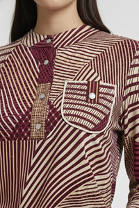 Step out in style with the Geometric Patchwork Jersey Top, a captivating piece defined by its intricate, modern design. This top features a bold arrangement of linear and striped geometric patterns that are expertly paneled together for a truly unique look.