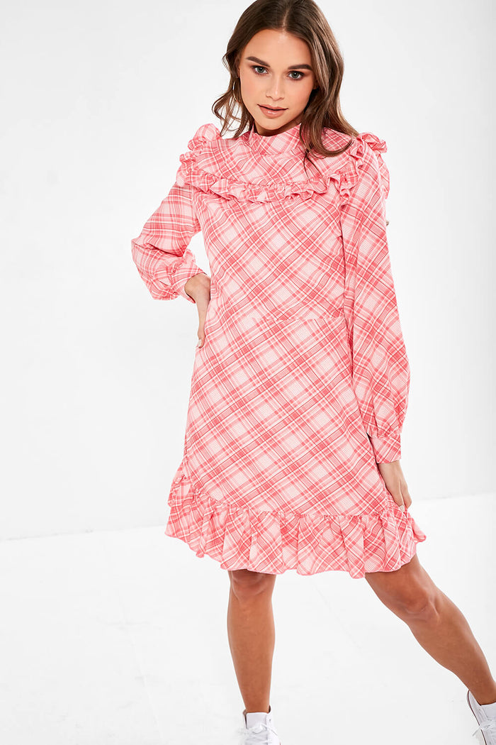 Cleo Long Sleeve Ruffle Dress in Pink Check