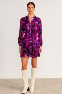 Bring bold romance to your wardrobe with this floral smock dress. Designed in vibrant shades of pink and purple, this dress features a flattering V-neckline with button detail, long sheer sleeves, and an elasticated waist for a comfortable yet feminine fit. The layered hem adds playful movement, making it perfect for both daytime outings and evening occasions. Pair with boots or heels for versatile styling.
