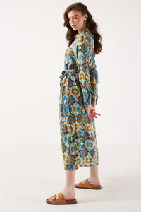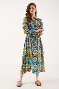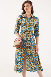 Enjoy timeless style with this Sammy Marc Angelo Shirt Dress. This midi-length dress features a self-fabric belt which allows adjusting it and a funky boho-like print. Made in viscose, it has a soft touch. Style it with sliders or sandals for a casual look. If you are looking for a cooler outfit, accessorize it with a black and gold belt, boots, and gold jewellery, keep the top buttons open and add a leather jacket or a fringed vest.