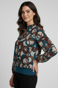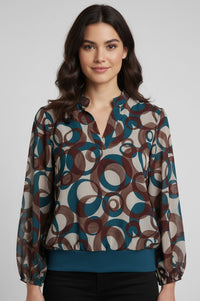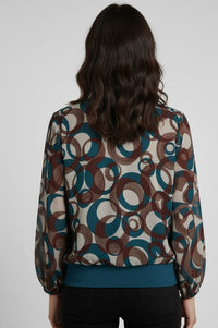 Step up your style game with this eye-catching blouse featuring a bold geometric circle print in teal, brown, and cream. Crafted from a lightweight semi-sheer fabric, this blouse offers an effortlessly polished look with a relaxed fit. The banded hem creates a flattering blouson silhouette, while the split neckline and elastic cuffs add subtle shape and comfort. Ideal for pairing with tailored trousers for the office or jeans for a casual day out.