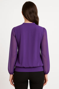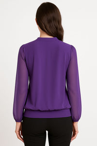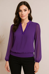 Elevate your wardrobe with this chic deep purple blouse, designed with a touch of sparkle for day-to-night versatility. Featuring a flattering V-neckline with silver sequin trim, this blouse brings understated glamour to your look. The long sleeves with elasticated cuffs and a softly gathered hemline ensure a comfortable fit with a refined silhouette. Perfect for pairing with tailored trousers or jeans, this blouse is a timeless piece that transitions effortlessly from office to evening.