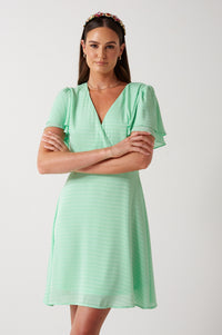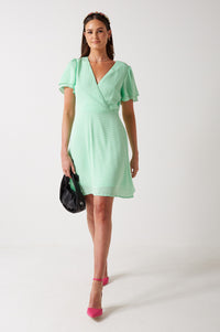 Dress up this cute printed short dress with heels and a matching bag, featuring a faux wrap front and short tiered sleeves.