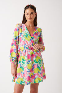 This stunning short dress is a great addition to your dress collections, featuring a unique print and silver buckle detail, style with heels and clutch to complete the look.