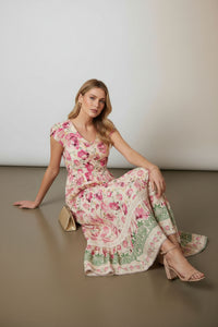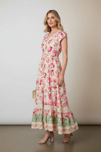 Embrace sophisticated charm with the Stella Floral Print Maxi Dress, featuring a vibrant pink floral design on a soft beige base, an empire waist, and a tiered skirt with lace trim. This V-neck dress is perfect for effortless elegance on any occasion.