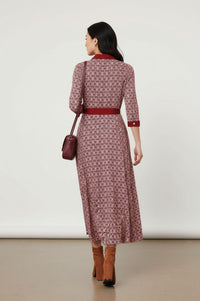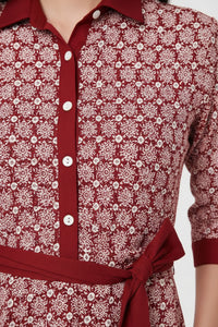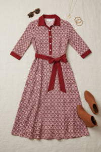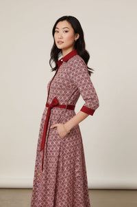 Embrace sophisticated charm with our Printed 3/4 Sleeve Tie Waist Maxi Dress. This collared shirtdress features a captivating red and white geometric pattern, a flattering self-tie waist, and convenient side pockets, perfect for effortless style from office to evening.