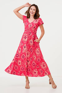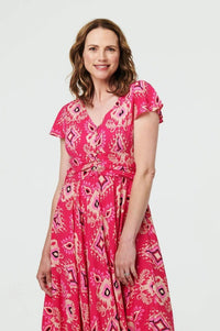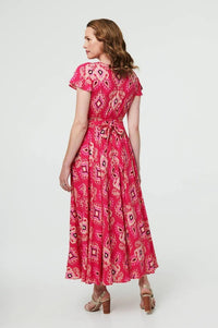 Printed Ruched Angel Sleeve Maxi Dress with a v-neck, pockets and buttons.