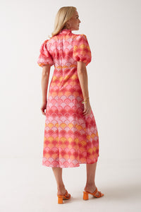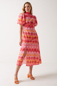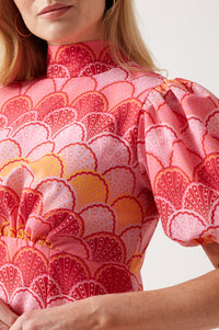 Lucinda Puff Sleeve High Neck Shell Print Midi Dress in Pink