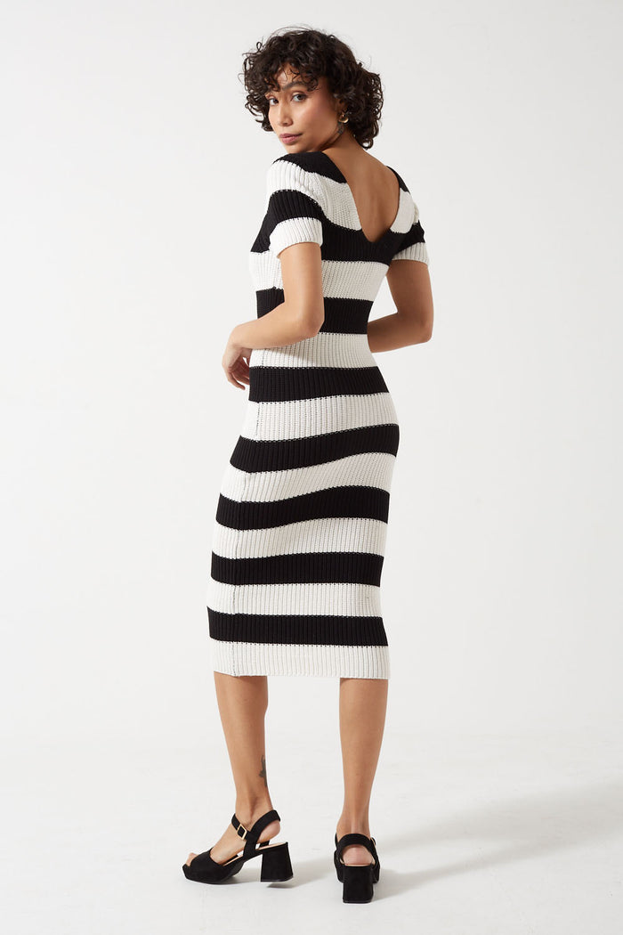 Ruth Short Sleeve V-Neck Midi Knit Dress Striped in Black and White