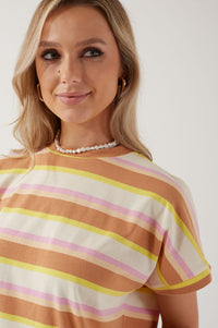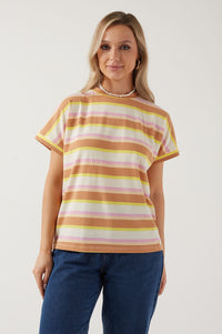 Featuring a striped pattern in shades of pink, brown, nude and yellow, the Lipa T-shirt is a cute option to renew your basics this season. Wear it with beige, brown or blue jeans and retro-like trainers to enhance the 70's vibe from this top.