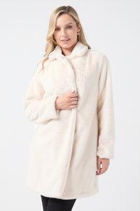 Long coat made of faux fur in a gorgeous cream colour. Featuring a fabulous soft feel and lapel collar, long sleeves, front pockets and hidden snap-button fastening at the front.
