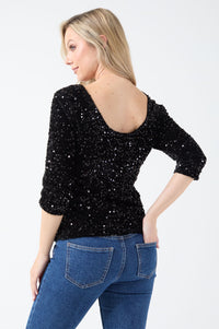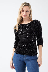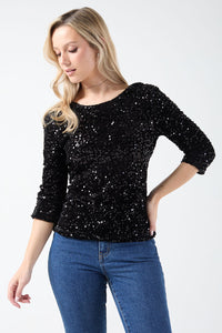 Add sparkles to your 'jeans and nice top' combo with this sequin top from MARC ANGELO. Featuring three-quarter sleeves, and sequin detail on a luxurious blue velvet base. Perfect for wearing with high waist skirts or with our coated Margo trousers.
