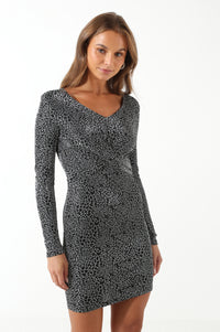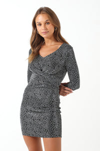 Queen L/S V-Neck Glitter Leopard Print Dress in Silver