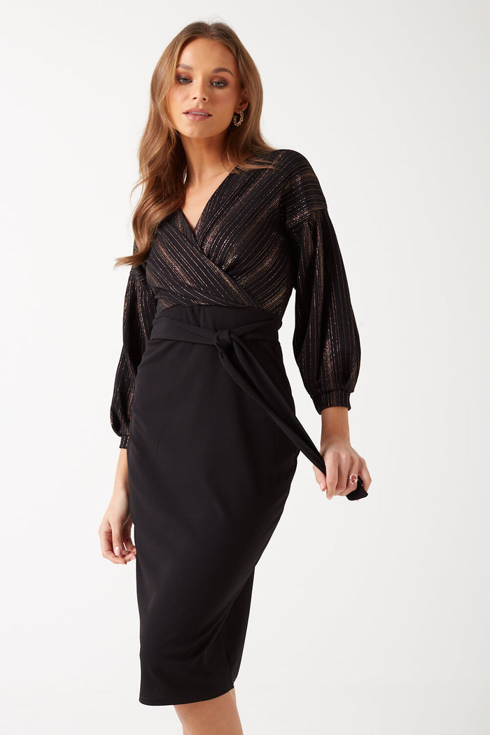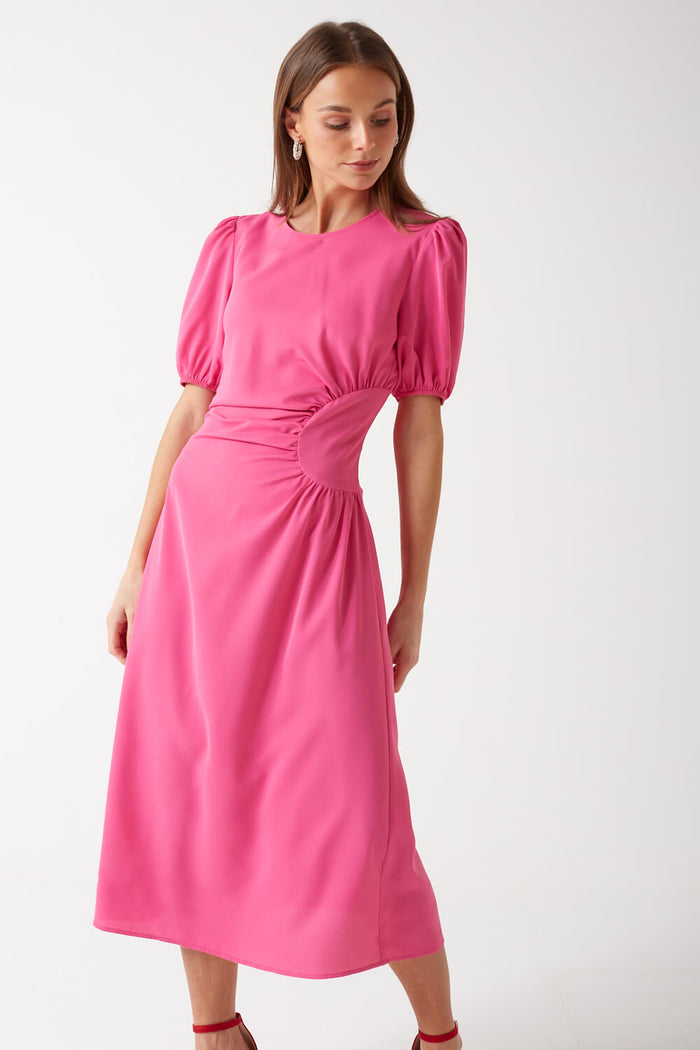Charleena Ruched Side Puff Sleeve Midi Dress in Pink