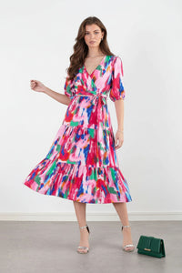 The dress features a v-neckline and a wrap style, tied at the waist with a ribbon. The fabric has a multi-colored abstract print, with shades of pink, red, green, blue, and various other colors, creating a dynamic and eye-catching pattern. The dress has a tiered skirt with ruffles at the bottom.
