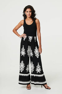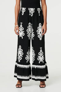 Keep cool and relaxed in the warm summer months in these wide leg trousers. They have an elasticated high waist and a frilled detail on the hems. Wear them with a vest top and sandals for a relaxed summer look.85%Viscose 15%Polyester.