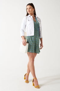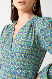 Update your dress collection with this wrap dress, featuring a printed design. Dress up or down depending on your occasion.