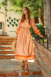 This midaxi dress is a summer wardrobe hero piece. Designed with eye-catching an orange abstract print on a neutral base, soft puff sleeves and an elasticated waist for ultimate comfort.