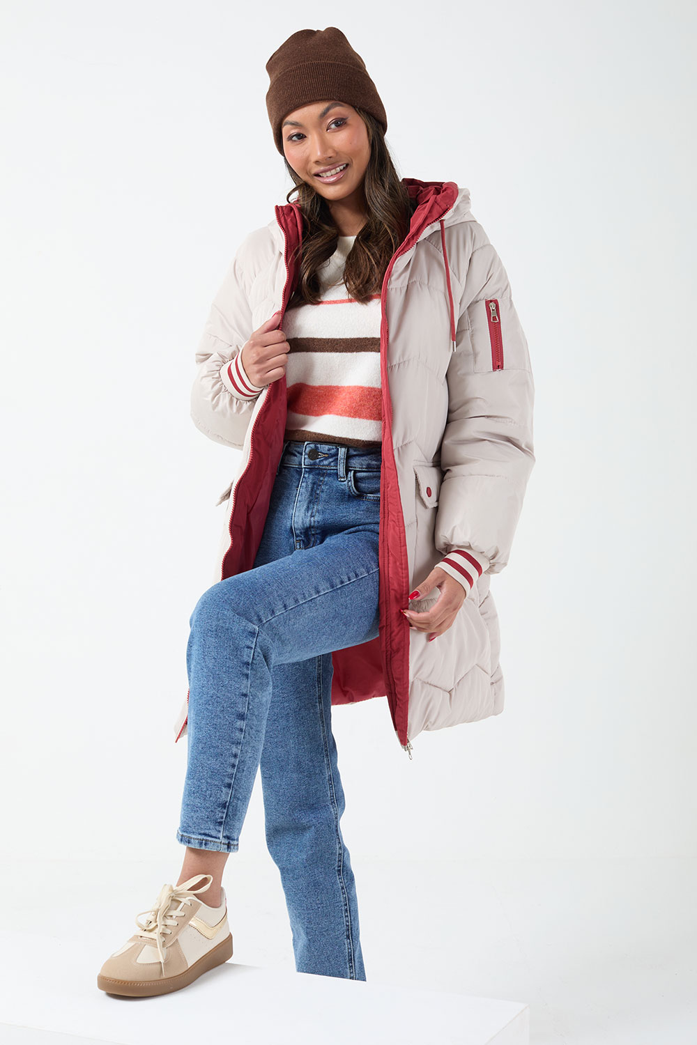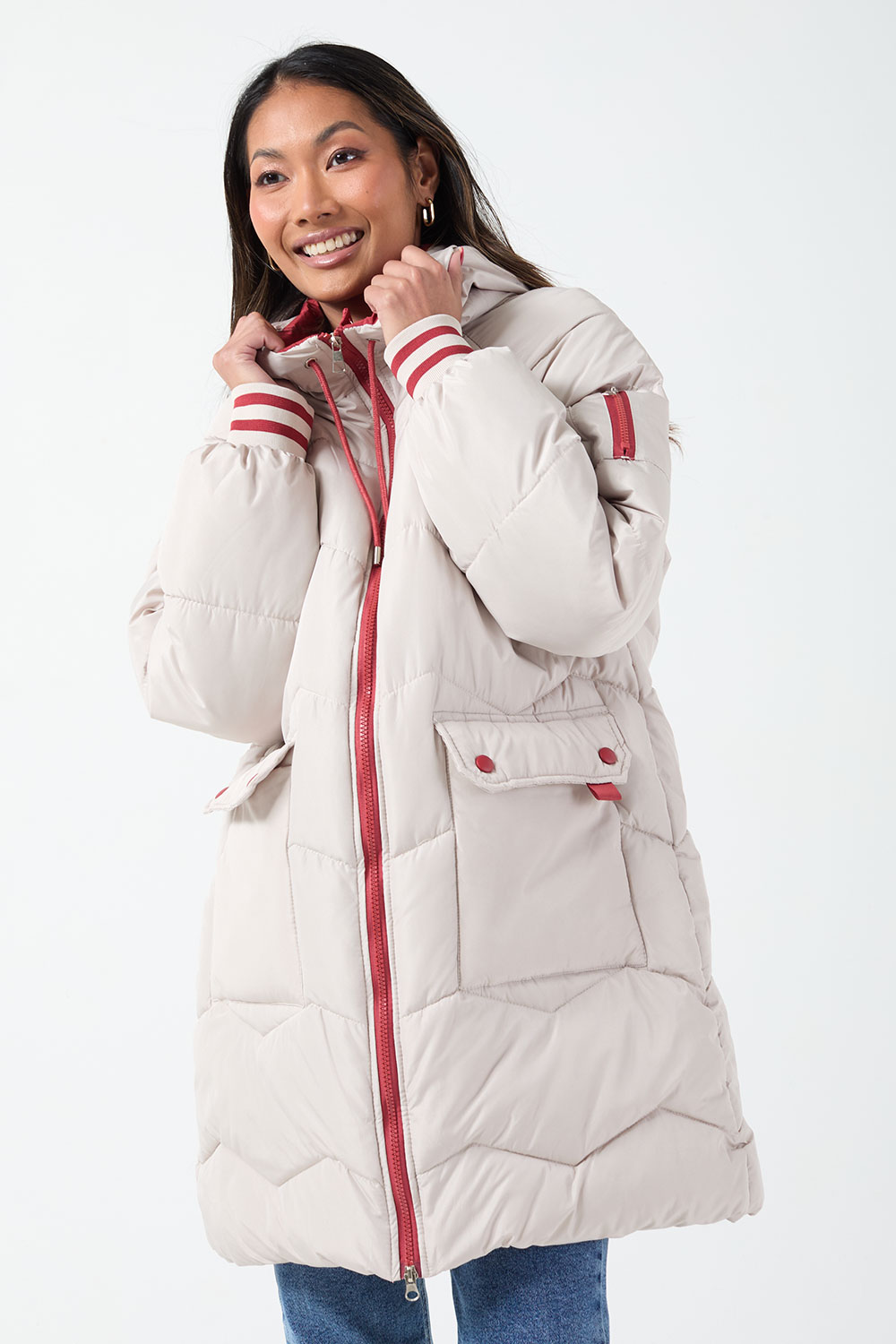 We are in love with this padded jacket new in from the Saint Maine collection. Something a little different from the usual in this fab beige and red colour way with contrast zipper lining and tie details. Twin pockets to the front
