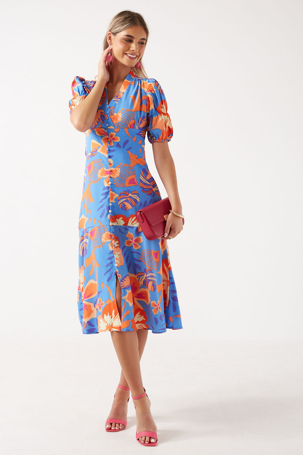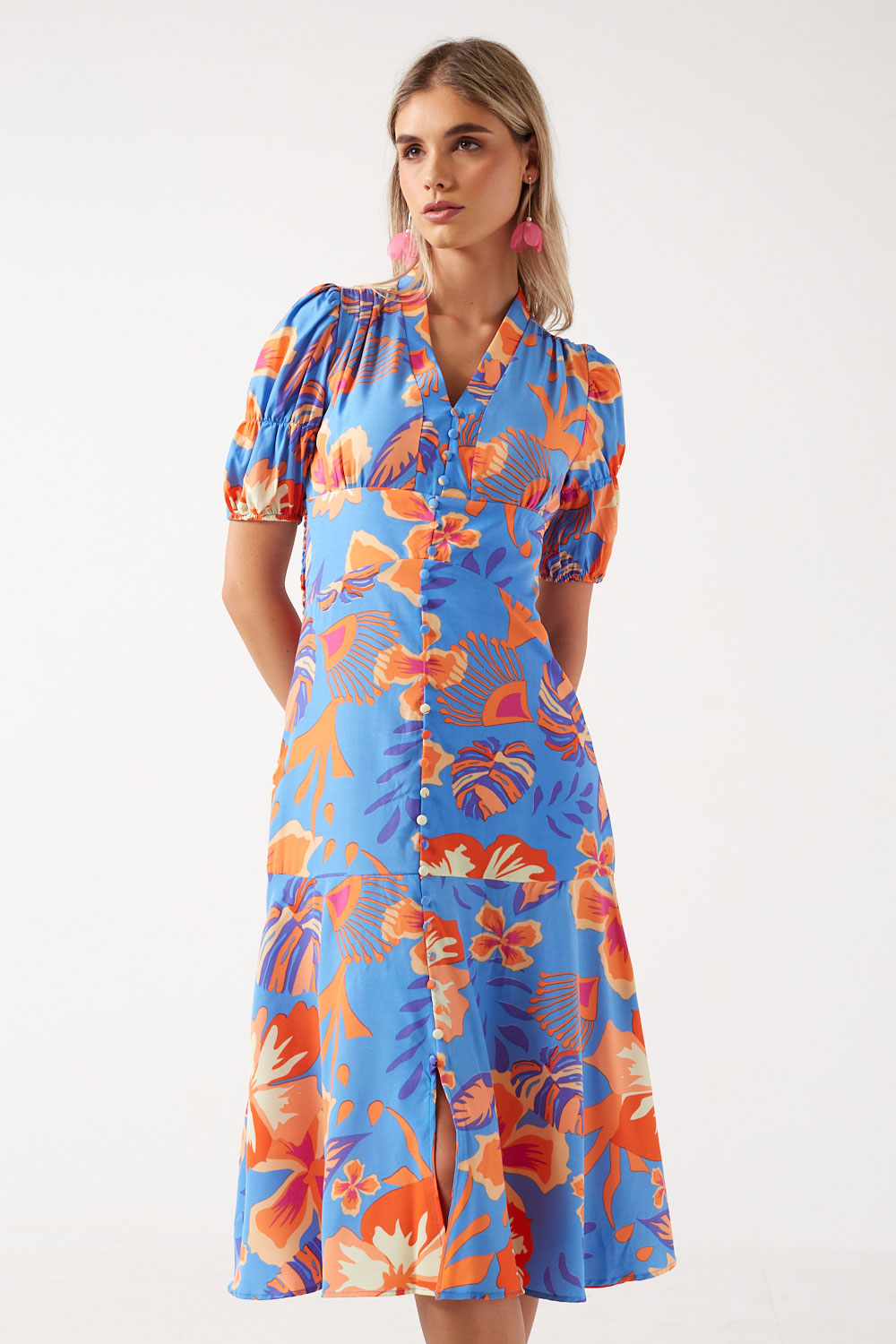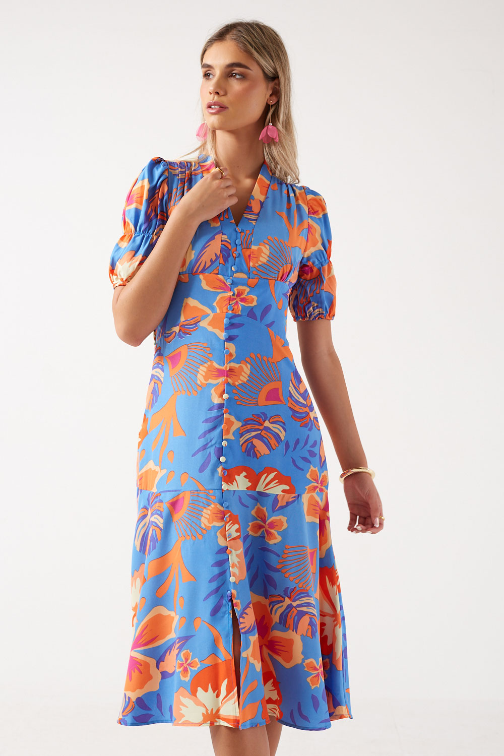 Featuring a fun colour combination in a Hawaian-like floral print and detailing with buttons at its front, the Helena midi dress will look gorgeous styled with high heels and a clutch; as well as if paired with white trainers and a denim jacket for a Holiday-style.