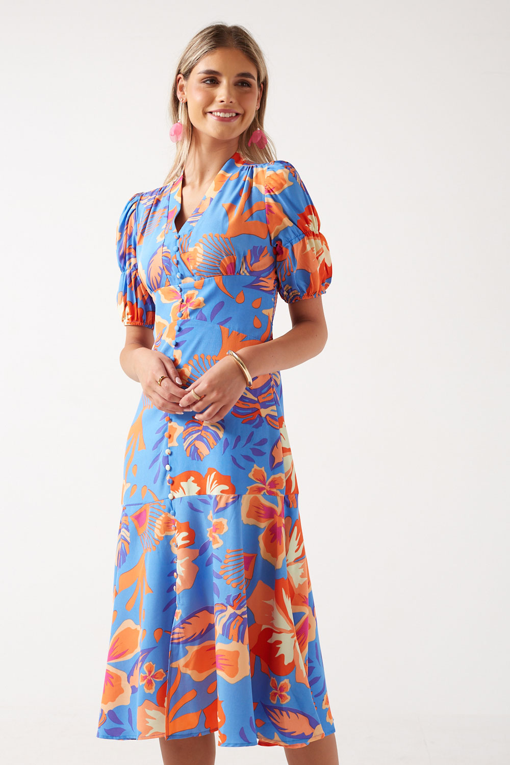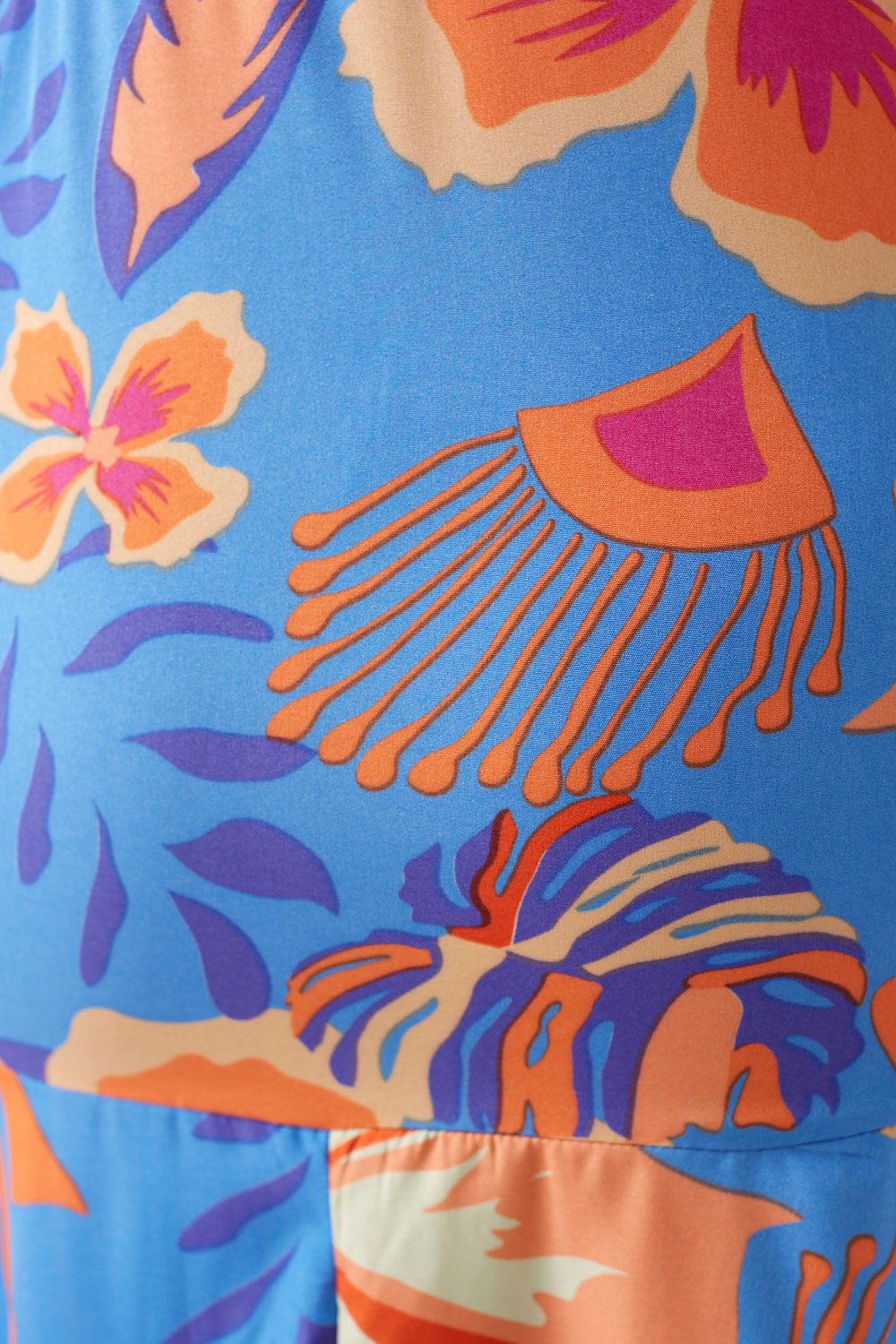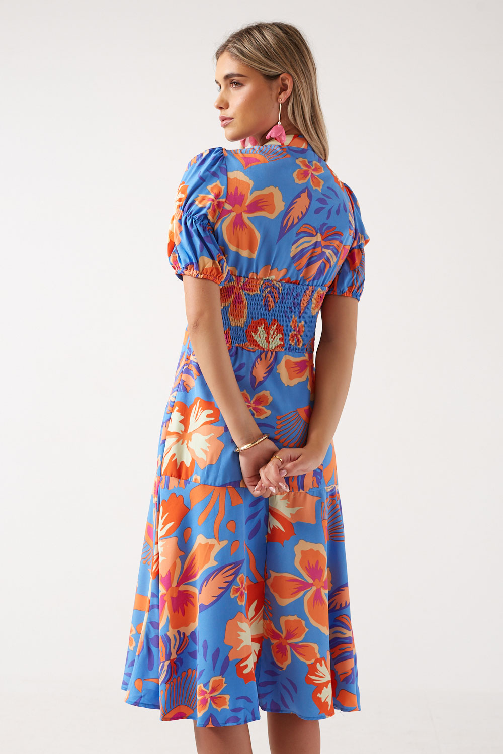Helena V-Neck Hawaian Floral Midi Dress in Blue