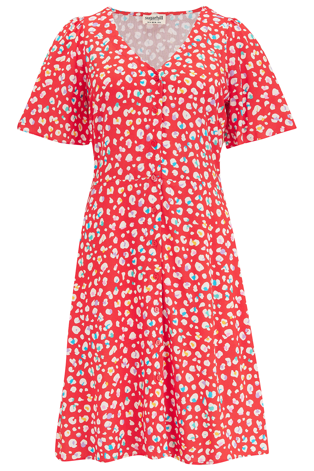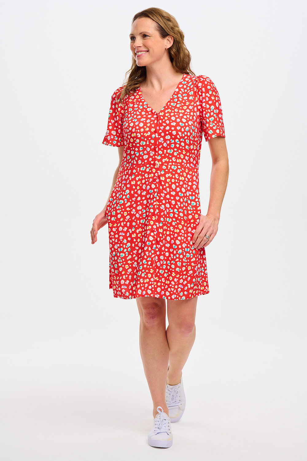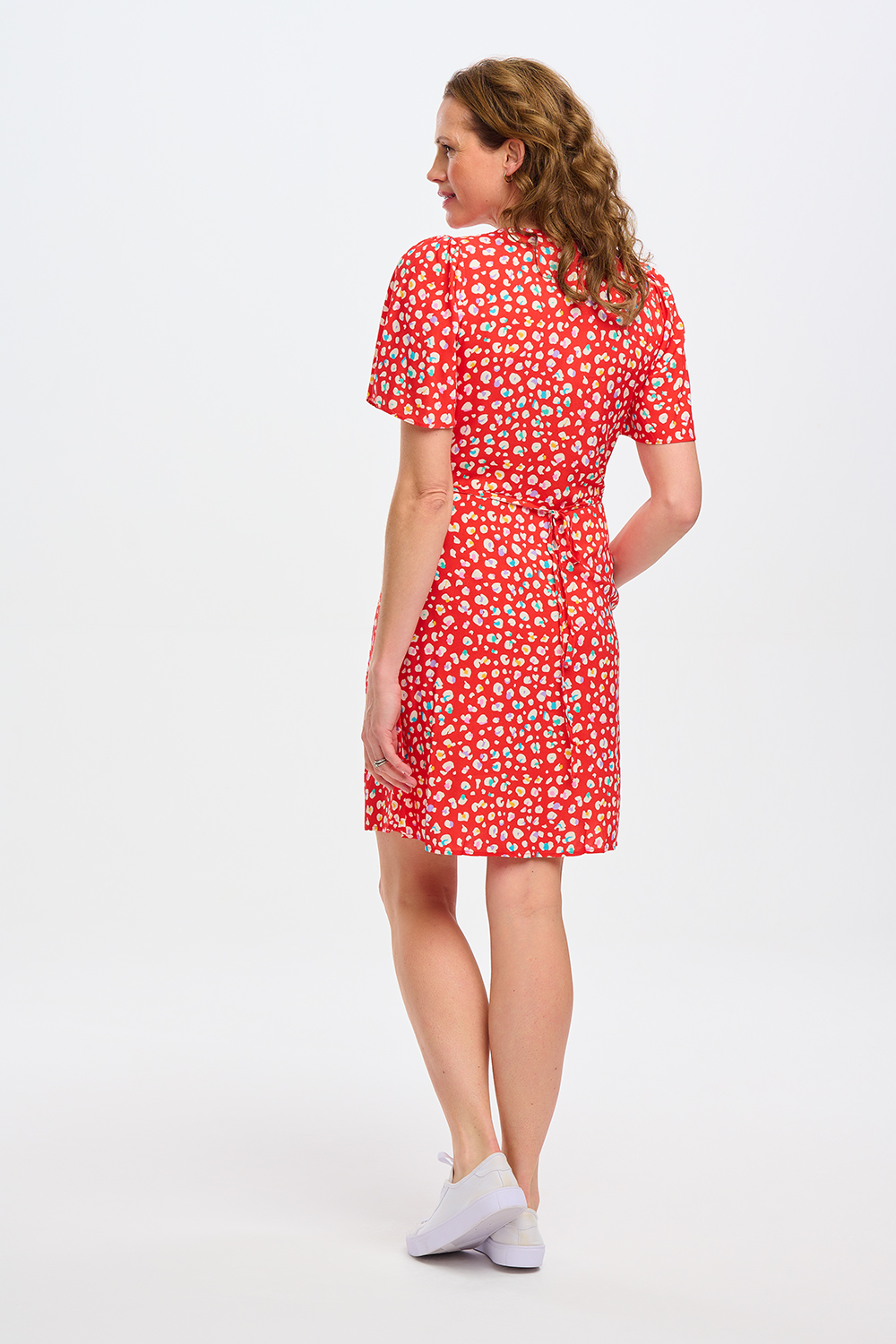 The Kari Dress is a cute everyday dress for the summer. Featuring a tie belt back, a V-neck, short fluted sleeves and mini skirt., it will look fab paired with white trainers.