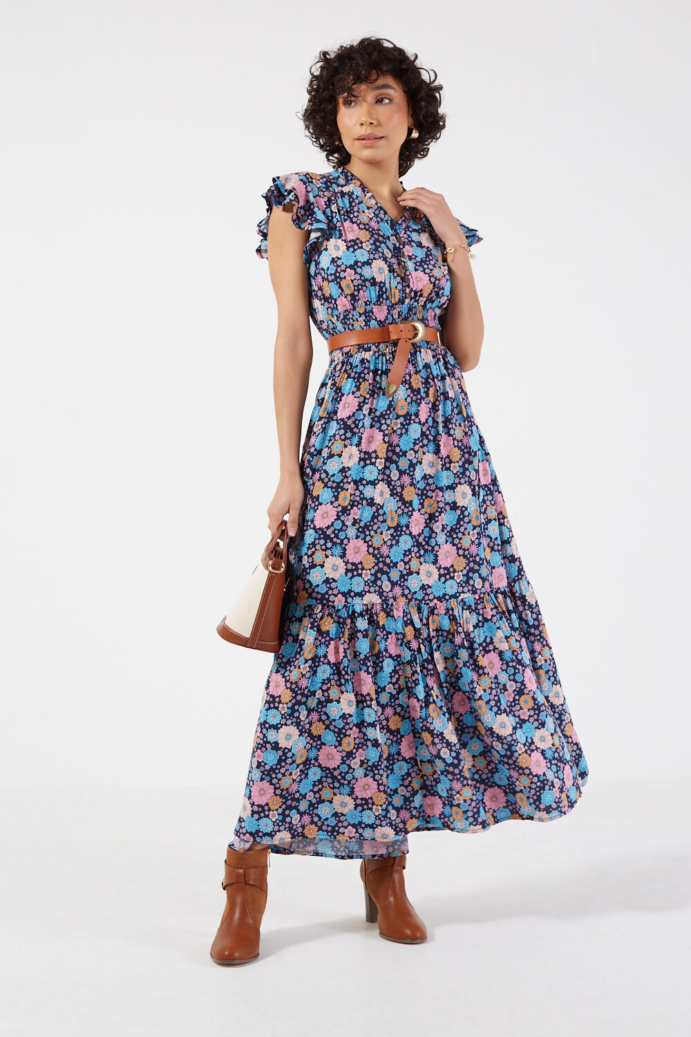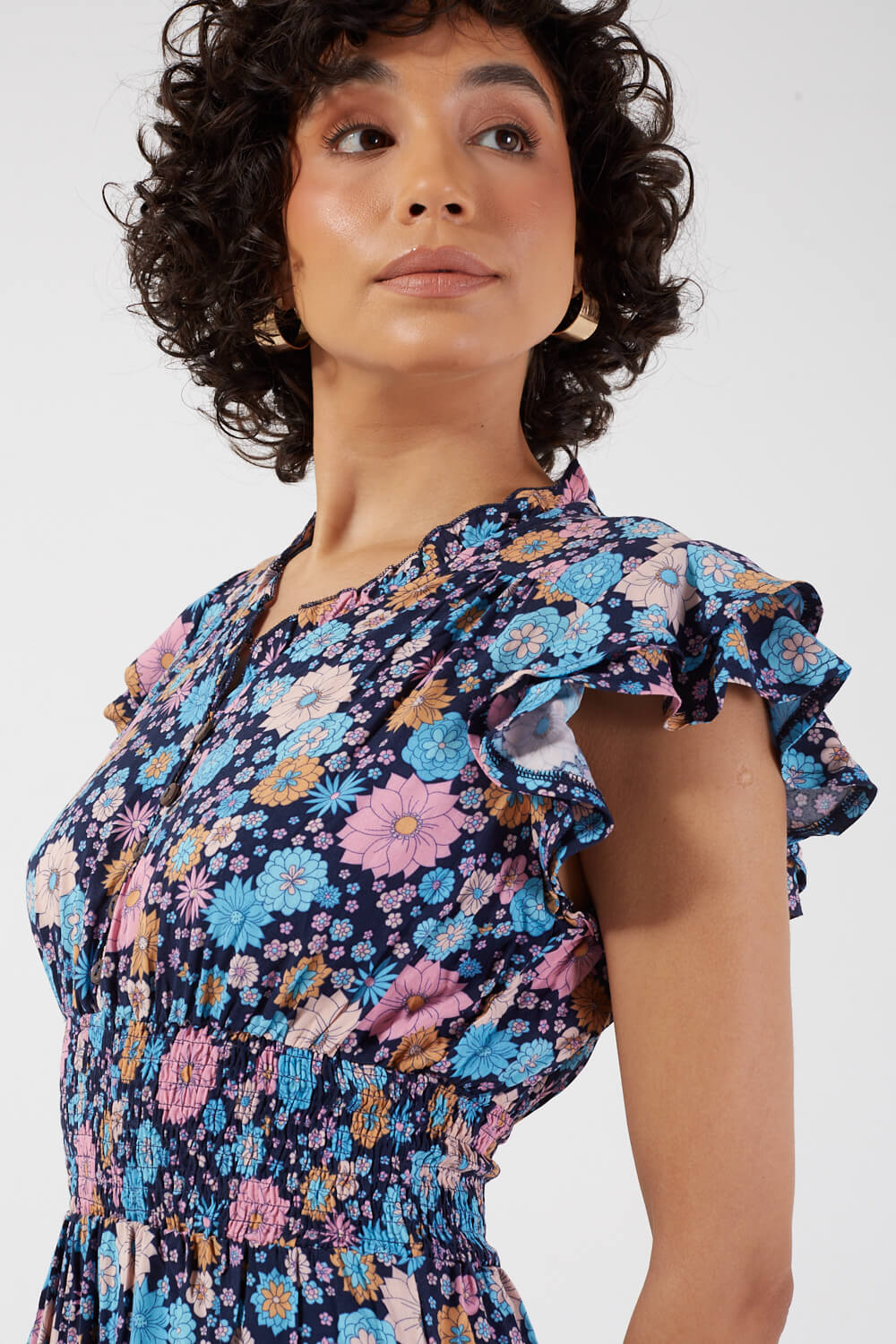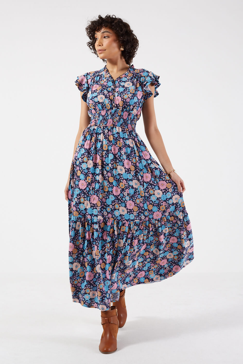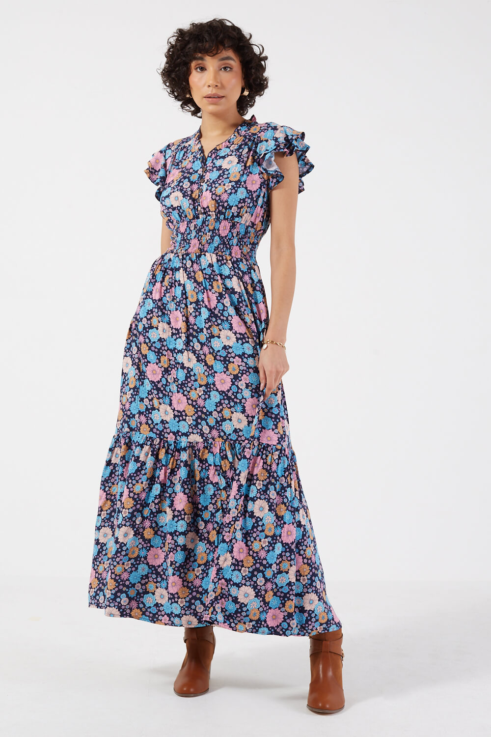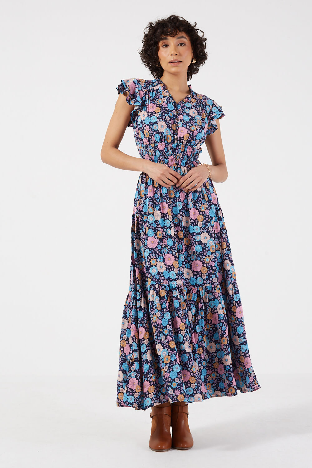 Featuring a smock detail at its waist, front buttons, V-neck, frilled cap sleeves and a maxi length, the Karla dress gains a vintage vibe with its adorable floral pattern. Style it with trainers or wedges, add a belt and a casual rustic bag for an easy to wear summer look.