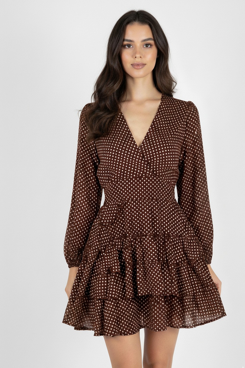 This chic, monochrome polka dot dress is a versatile addition to your wardrobe. Crafted from a lightweight, flowing fabric, it features a flattering wrap silhouette with a tie waist that cinches you in for a perfect fit. The long sleeves are finished with a gentle ruffle cuff, while the tiered, frill-trim skirt adds a playful, feminine touch. Ideal for both daytime events and evening outings, this dress pairs effortlessly with heels or flats.