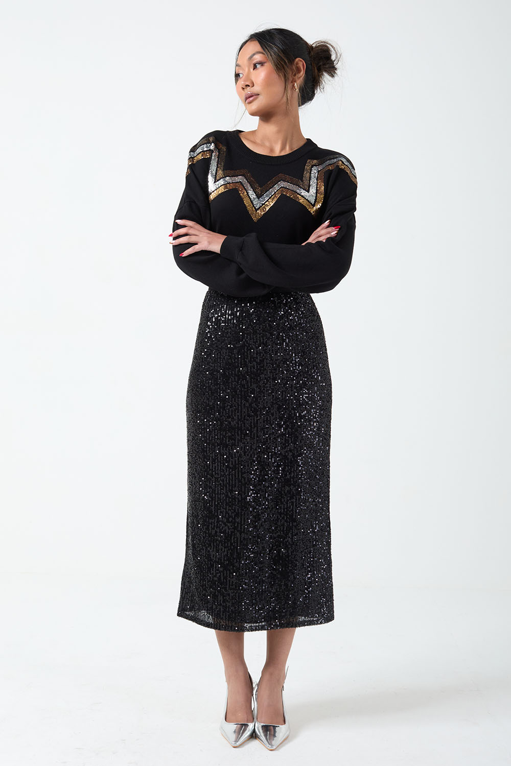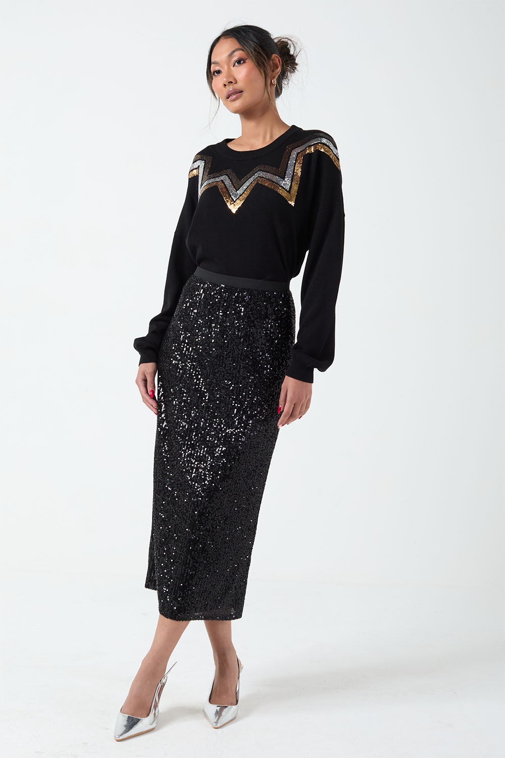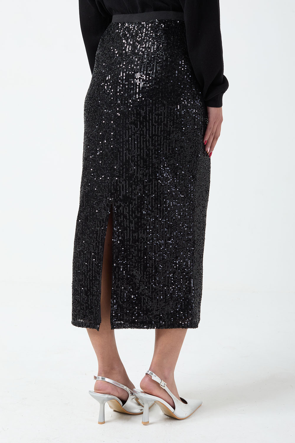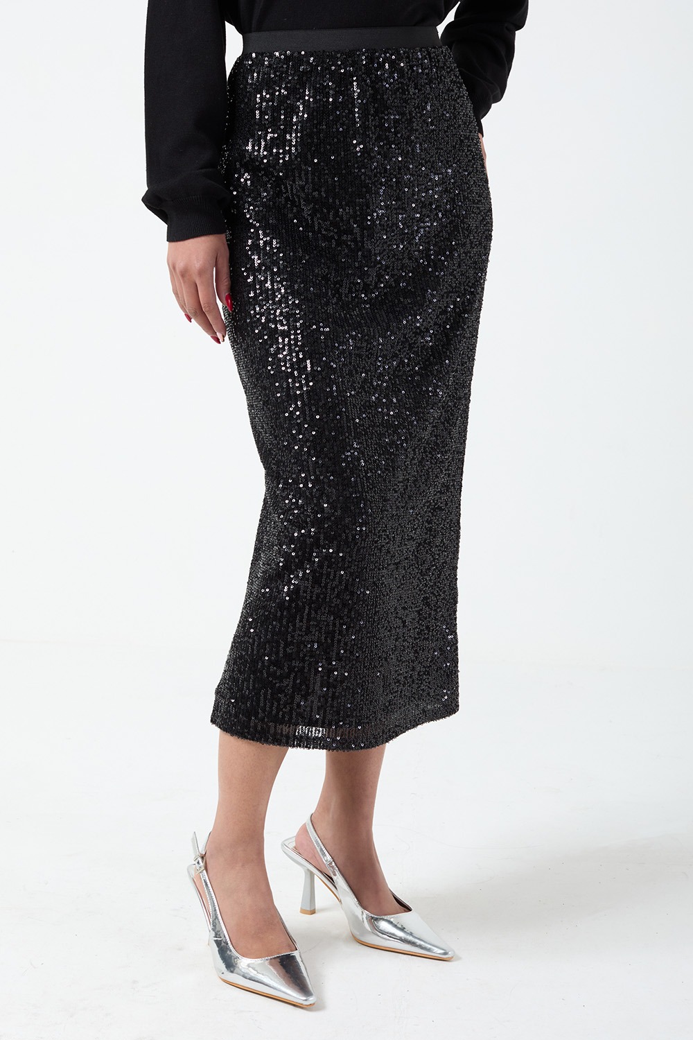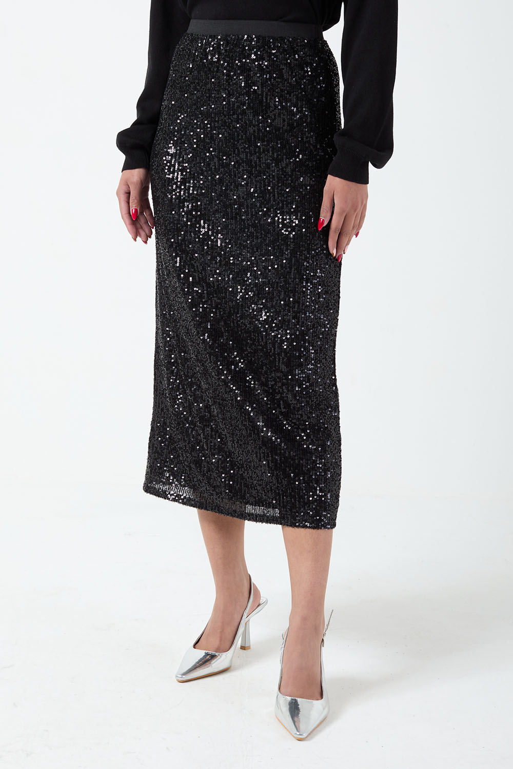 This seasons must have midi skirt in a fab black sequin style which is fully lined for comfort. Featuring delicate sequin to make you shimmer in shine and slit detail to the back and an elasticated waistband.
