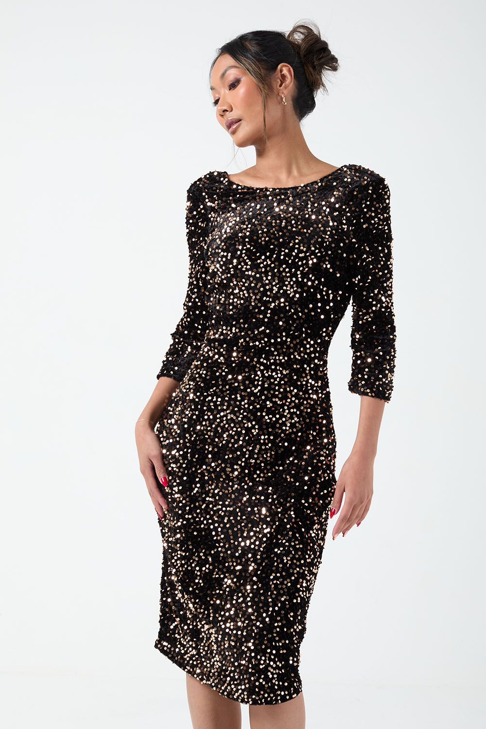 Get ready for party season with this allover sequin embellished dress. Featuring an open back and a slim design, team with heels and a matching clutch to complete the look.