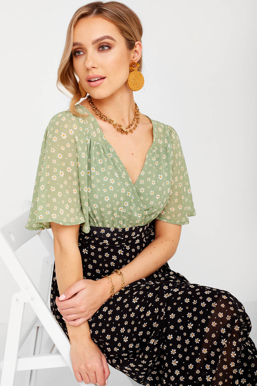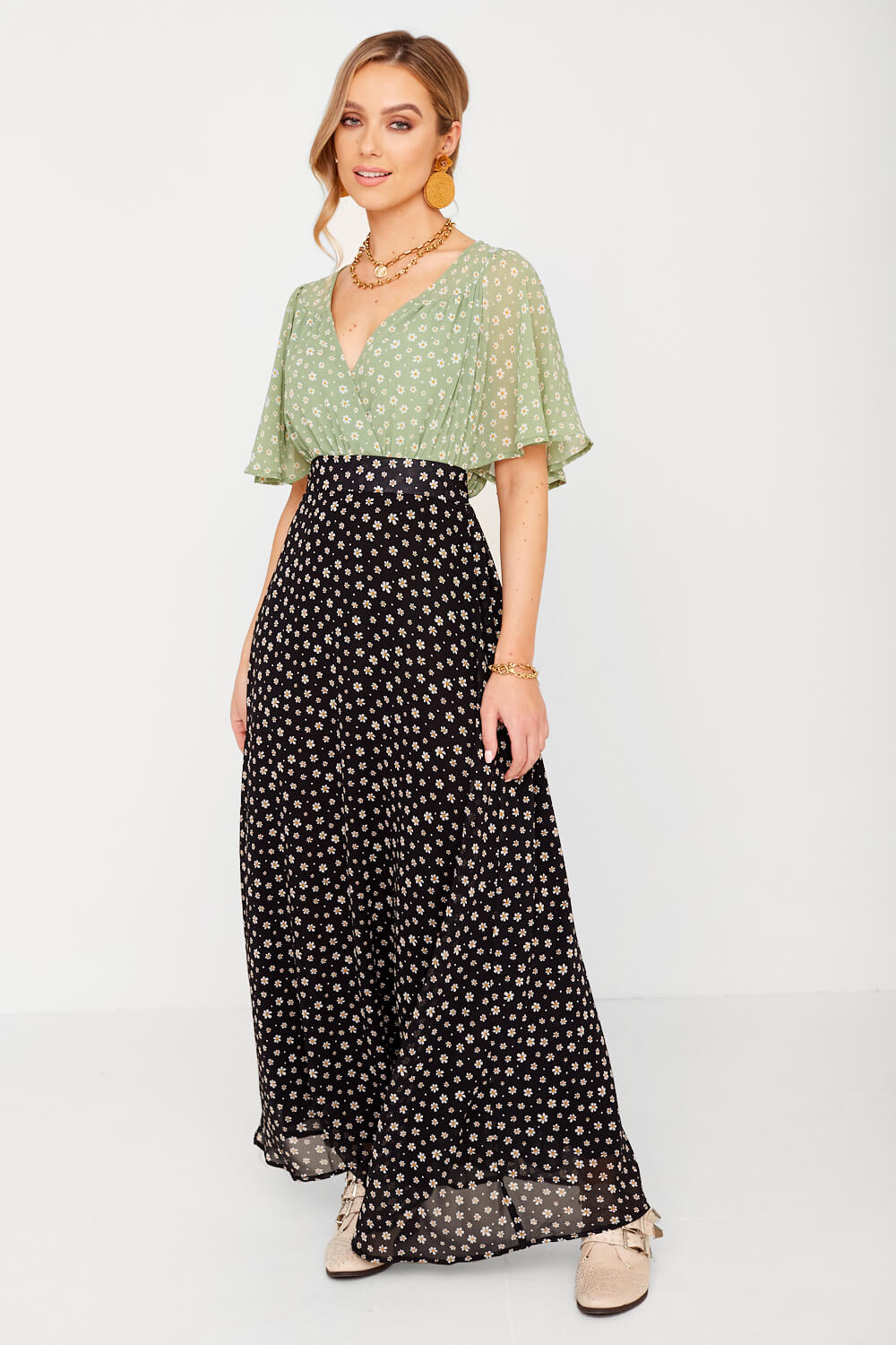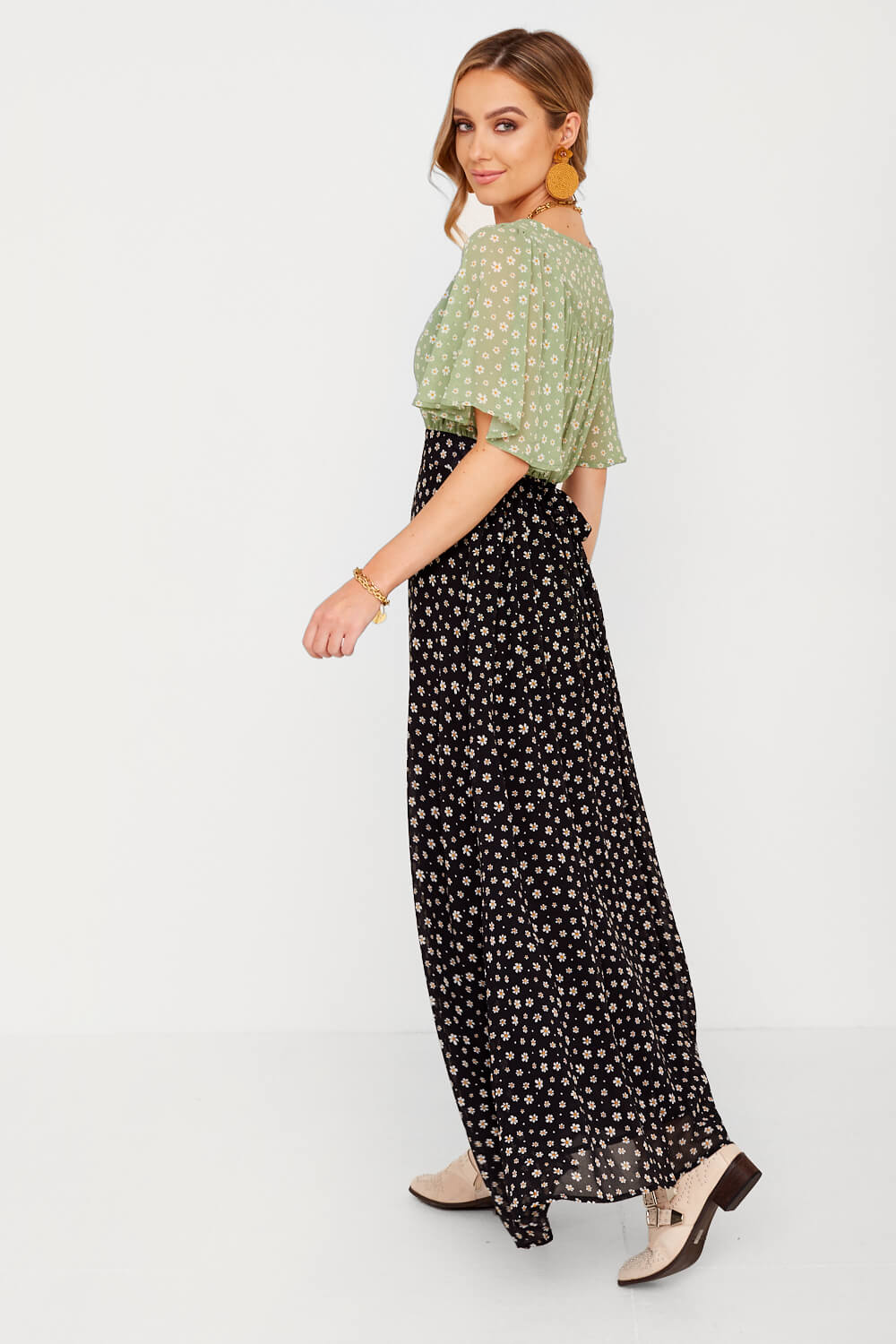 This daisy print maxi dress is the ultimate summer day dress. Contrast two tone print, maxi length skirt for extra movement and a tie-waist belt to define the waistline and maximum comfort.