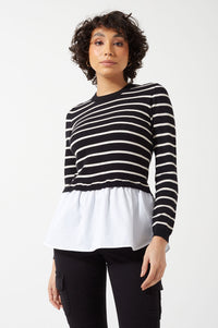Angie Life LS Shirt Detail Striped O-Neck Jumper in Black
