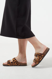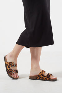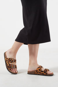 Easy-to-wear and trending this season, the suede sliders with two straps are a comfortable everyday option.Easy-to-wear and trending this season, the suede sliders with two straps are a comfortable everyday option. The leopard print add a cool and fashionable touch to them. Wear them with jeans a shirt or with coulette trousers and a top for a summer look.