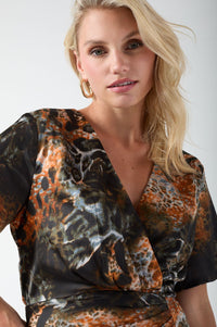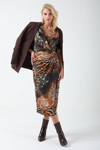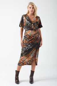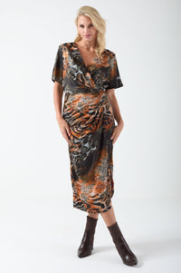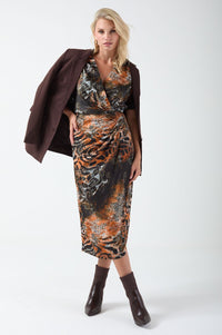 New in from Marc Angelo is the Cleo animal print dress, featuring a waist tie and frill cuffs. Pair with our blair heeled ankle boots for a stylish daytime look.