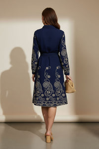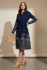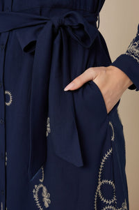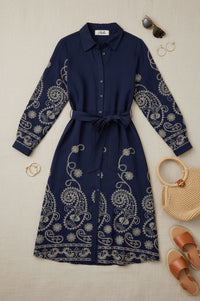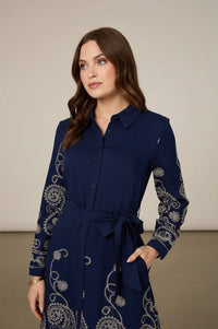 Embrace sophisticated charm with this Stella midi shirt dress, featuring intricate gold paisley and floral embroidery. Its collared neckline and self-tie waist create an effortlessly elegant silhouette perfect for any occasion.