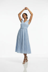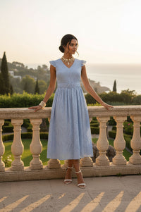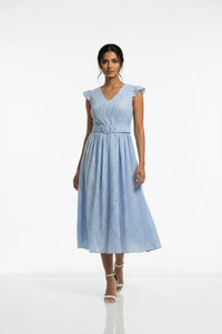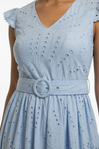 Embrace effortless elegance and intricate detail with the MARC ANGELO Light Blue Eyelet Lace Midi Dress. This charming A-line midi dress features a flattering V-neckline and delicate cap sleeves finished with scalloped lace trim. Its defining characteristic is the all-over light blue eyelet lace fabric, intricately patterned with geometric and floral perforations. A matching fabric-covered belt cinches the waist, secured by a chic tonal circular buckle, leading into a gracefully gathered, voluminous skirt. Crafted from breathable eyelet lace, this dress offers a lightweight and airy feel, perfect for warmer weather. It provides a comfortable drape without stretch. Ideal for garden parties, brunches, or daytime events, pair this versatile dress with espadrille wedges and a woven tote for a quintessential summer look. This MARC ANGELO dress is designed to offer a true-to-size fit, providing comfort and style.