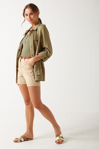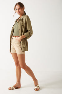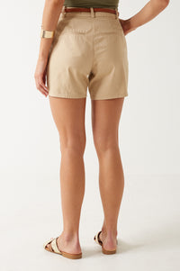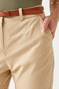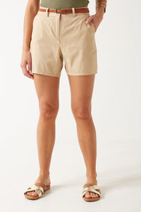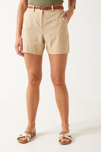 These beige chino shorts feature a belted waist, mid rise and fold up hem. Wear with a simple tee and trainers for a casual day look.