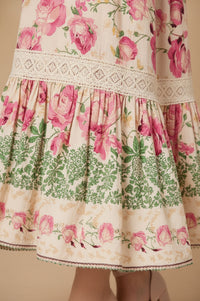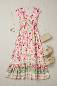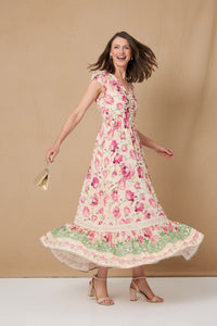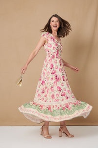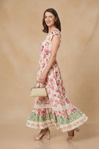 Embrace sophisticated charm with the Stella Floral Print Maxi Dress, featuring a vibrant pink floral design on a soft beige base, an empire waist, and a tiered skirt with lace trim. This V-neck dress is perfect for effortless elegance on any occasion.