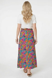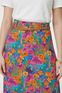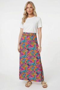 Embrace vibrant color and effortless style with the Stella Floral Print Maxi Skirt, perfect for sunny days. This high-waisted, ankle-length maxi skirt features a straight-cut silhouette with a smooth, flat front panel. It boasts a dense floral print in fuchsia, orange, yellow, green, and purple against a lively turquoise background. A tan woven belt with a circular silver-tone buckle is secured through four belt loops, adding a touch of bohemian charm. Crafted from lightweight woven fabric, this skirt offers a breezy and comfortable feel, ideal for warm weather. Its fluid drape ensures easy movement and a flattering fit. Pair this eye-catching skirt with a simple white tee and espadrille sandals for a chic casual look. It's perfect for vacation, weekend outings, or adding a pop of color to your everyday ensemble. Designed for a comfortable high-waisted fit, this Floral Print Maxi Skirt generally runs true to size.