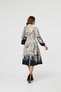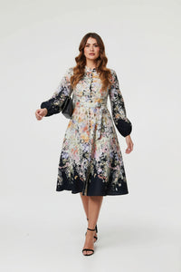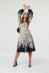 Floral Print Midi Shirt Dress in Black