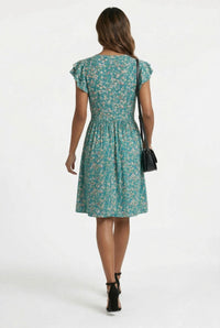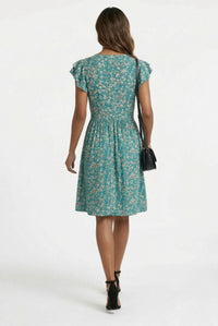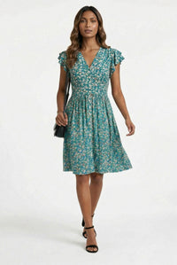 Capture effortless charm with the Stella Floral Ruffled Cap Sleeve Button-Down Dress. Discover this A-line silhouette on a vibrant teal green base adorned with a delicate ditsy floral print of white, pink, and yellow blossoms. This knee-length dress features a flattering V-neckline, charming double-layered ruffled cap sleeves, a full center-front button placket with white buttons, and a comfortable gathered waist with a smocked mid-back panel. Crafted from a lightweight woven fabric, this dress offers a comfortable feel with no stretch, perfect for warmer days. It drapes beautifully, providing an airy and relaxed fit. Pair this versatile dress with block heels for a brunch date or casual sandals for a stroll, making it your go-to for garden parties or weekend outings. This dress offers a comfortable, relaxed fit with a defined waist; consider sizing true to your usual.