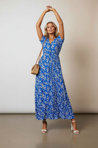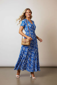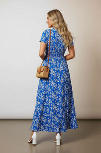 Embrace effortless style with the Stella Floral V-neck Maxi Dress, featuring a flattering smocked waist and a vibrant blue floral print. This lightweight piece is perfect for sunny days, offering both comfort and chic sophistication.