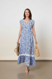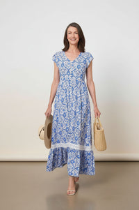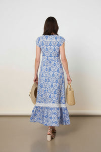 Embrace effortless elegance with this stunning blue and white printed maxi dress, featuring a flattering V-neck, cap sleeves, and a bohemian-inspired pattern. Complete with practical side pockets and delicate lace trim, it's perfect for warm-weather adventures or stylish everyday wear.